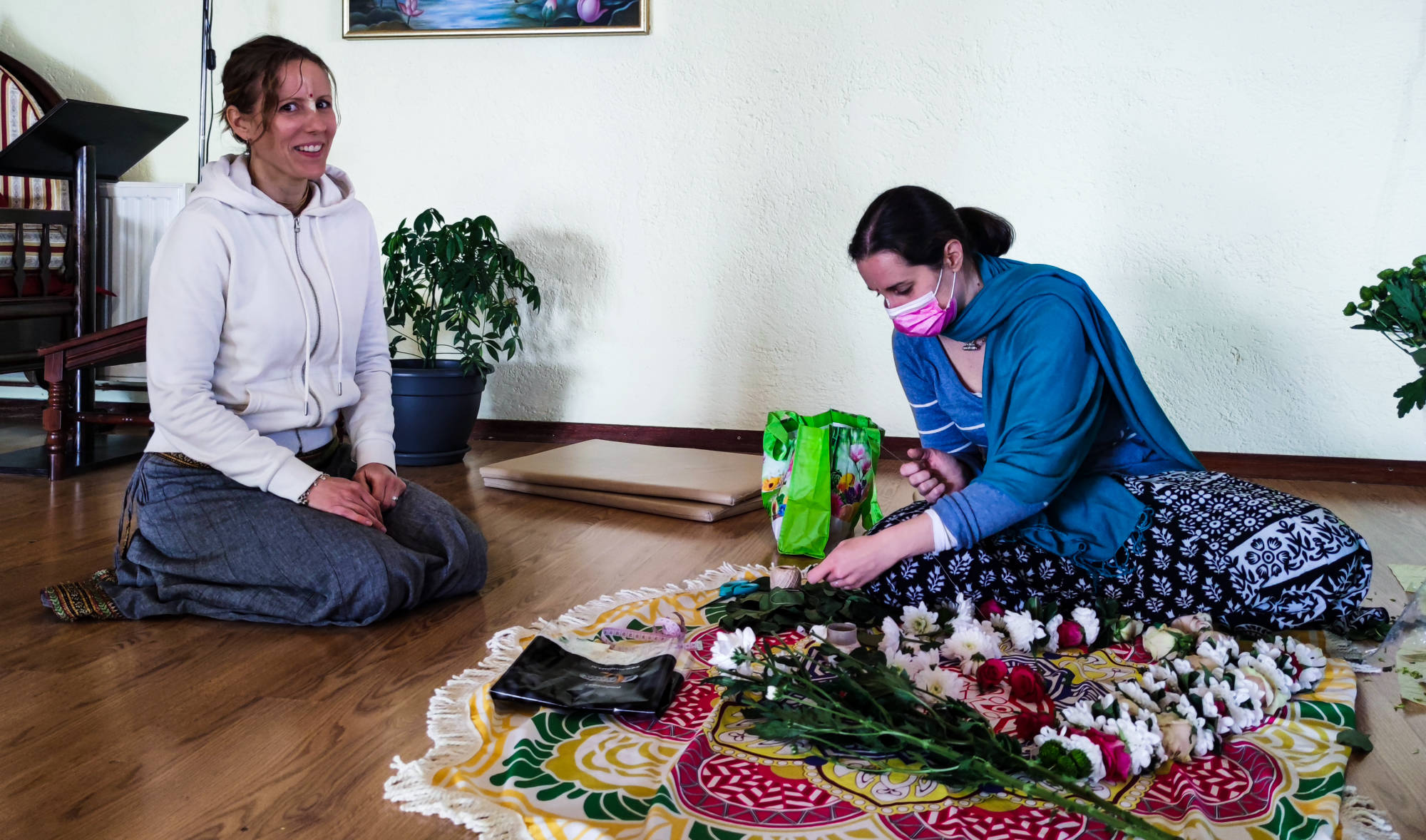 Manju-bhasini dd, Hema-gauri dd i Fani za uređenje hramske prostorije za festival.