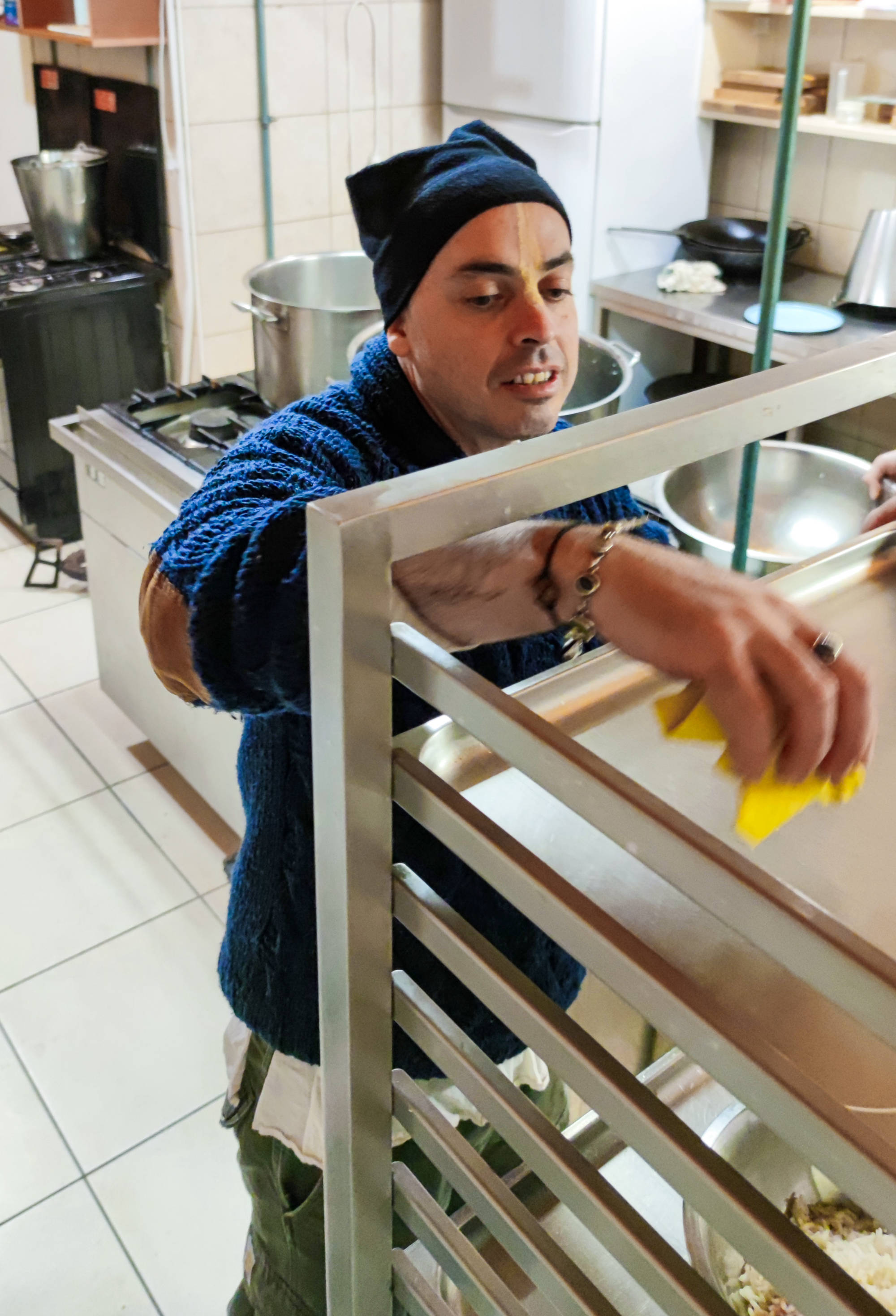 Dhanvantari d za mnoga kuhanja nedjeljom, sjeckanja, ponekad cijeli dan proveden u službi, često ostajanje kasno u noć čistiti kuhinju, prisustvovanje na jutarnjim programima u hramu itd.