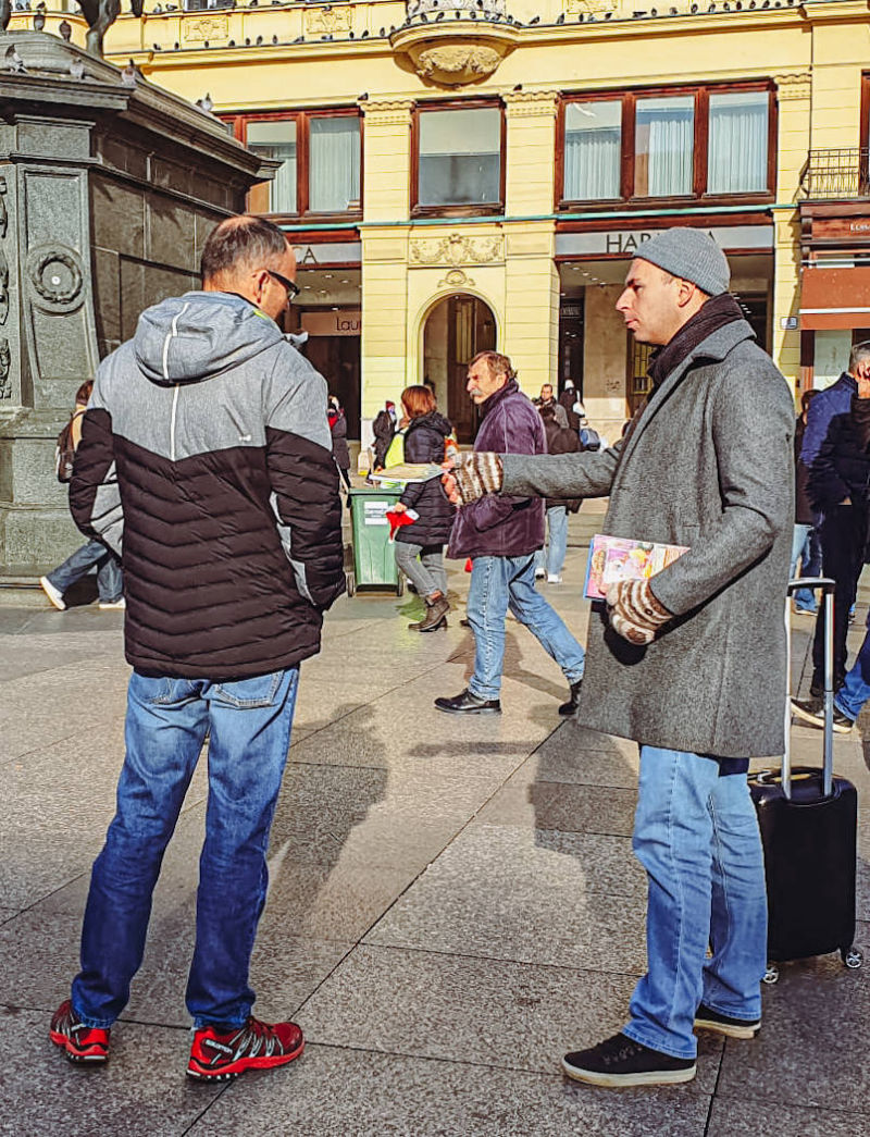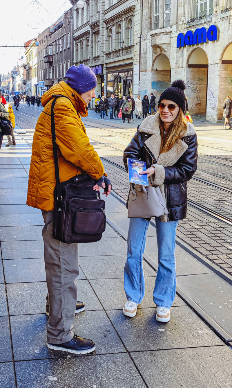 Tako je taj hodajući „ured“, odnosno Lomancita das, jedne subote prišao gospodinu Tihomiru i ponudio mu knjige, a ovaj ih je radosno prihvatio i uzvratio donacijom. Osim knjiga, Lomancita je Tihomiru uručio i osobni poziv na neko od naših druženja u hramu, na što je ovaj odgovorio da će razmisliti. Nije dugo trebao razmišljati, jer mu je nakon samo nekoliko minuta prišla i bhn. Kristina koja mu je, pogađate, ponudila knjige. Njezina ponuda knjiga ovaj put nije prošla, ali je prošao njezin osobni poziv na druženje s bhaktama. Tihomiru nije trebalo puno da shvati, kako mu je suđeno doći na program.