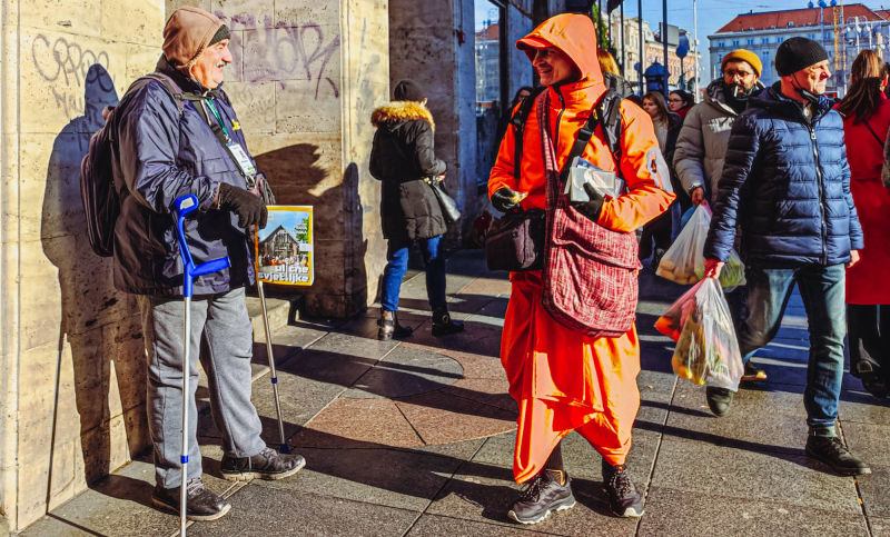 Jeste li znali da ISKCON Zagreb Nova Jaladuta hram ima u centru grada ured s radnim vremenom od 10:00 do 17:00 sati? Jedini je problem što mu lokacija nije fiksna, pa ako ga želite posjetiti morate se malo prošetati između trga Bana Jelačića, preko Zrinjevca do Glavnog kolodvora. Pokretni ured je lako prepoznati, jer je svjetlucavo narančaste boje, a iz njega se čuju zvuci Prabhupadinih bhajana. Moguće je da će taj "ured" prije vas zaustaviti, nego što ćete ga vi sami pronaći.