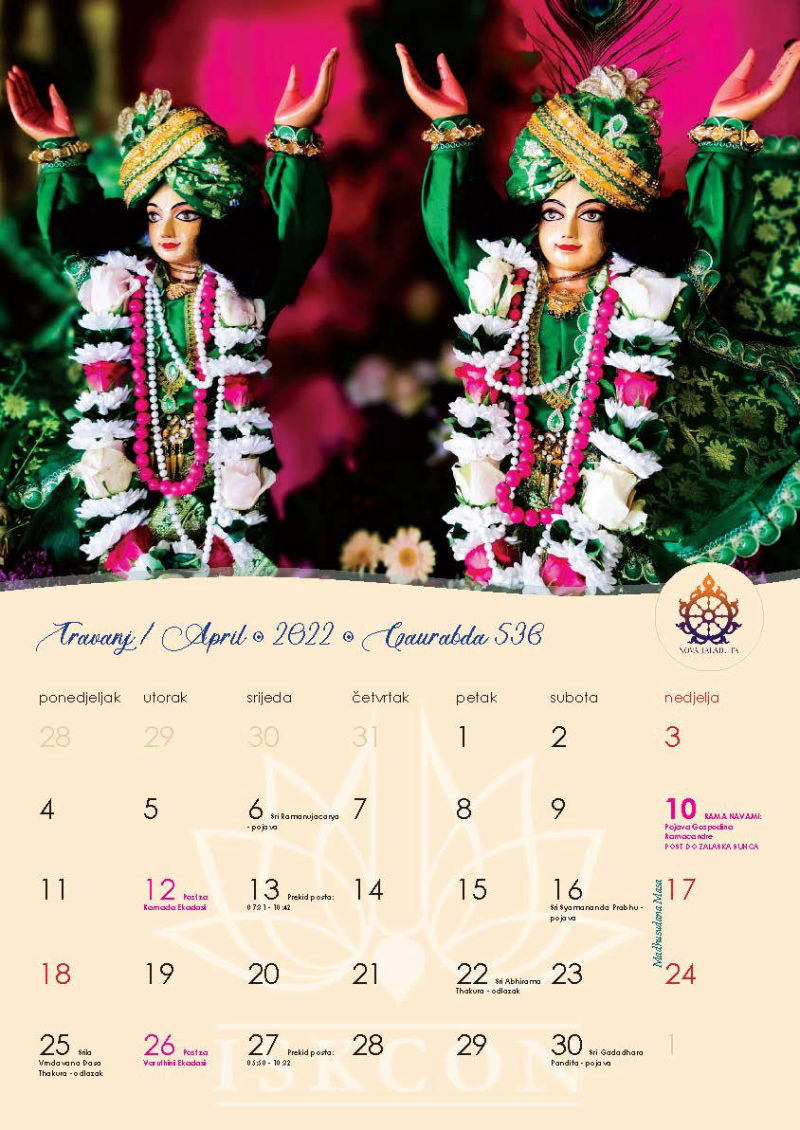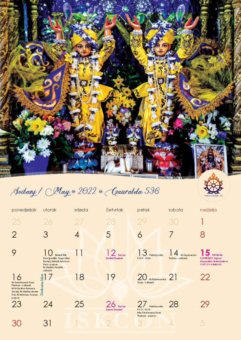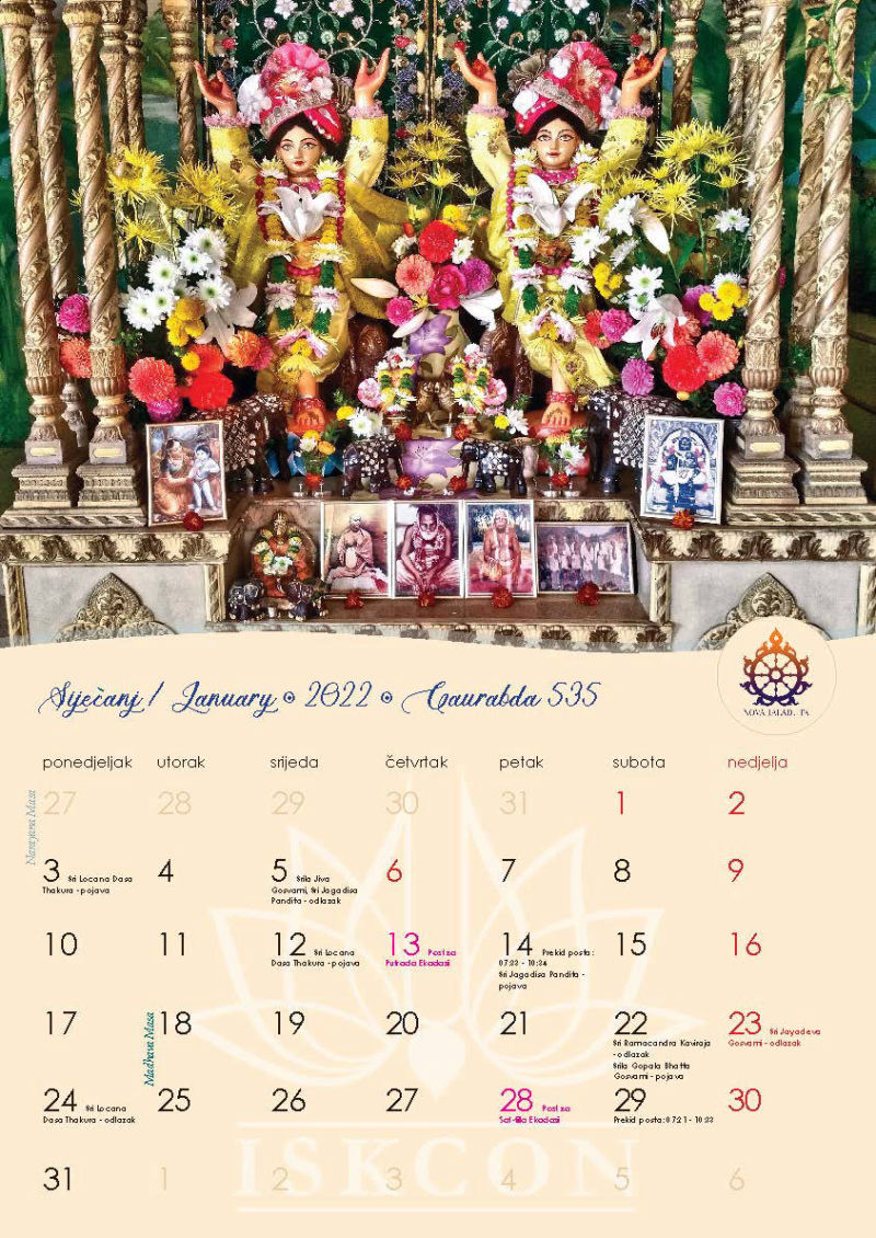 Novi kalendar za 2022. godinu s motivima naših prekrasnih Sri Sri Gaura Nitai te svim značajnim datumima koje vaišnave obilježavaju, napokon je izašao iz tiska i možete ga preuzeti u zagrebačkom hramu ili naručiti poštom, ako već niste.