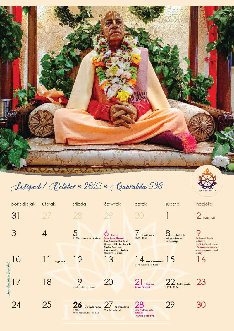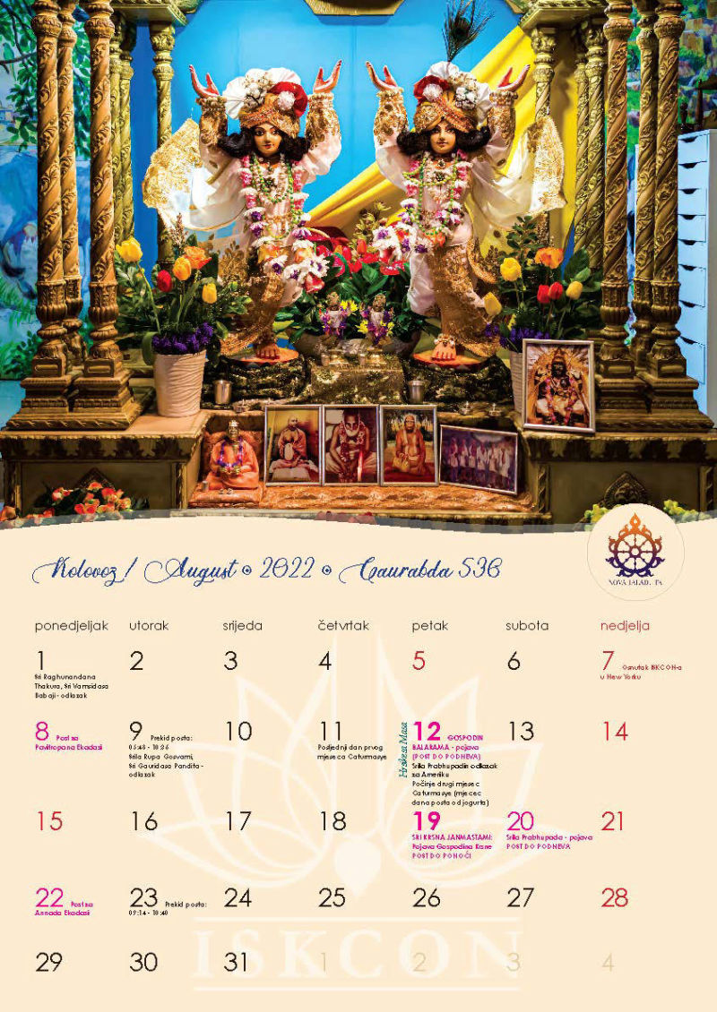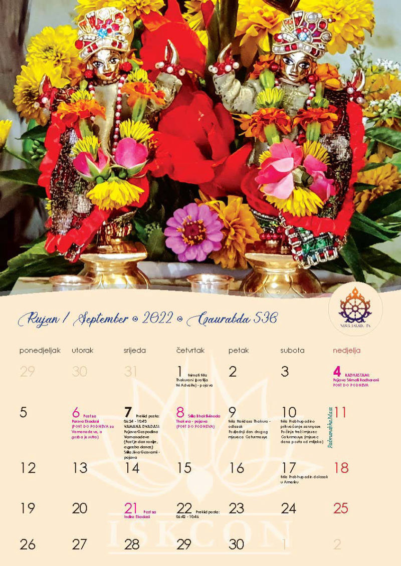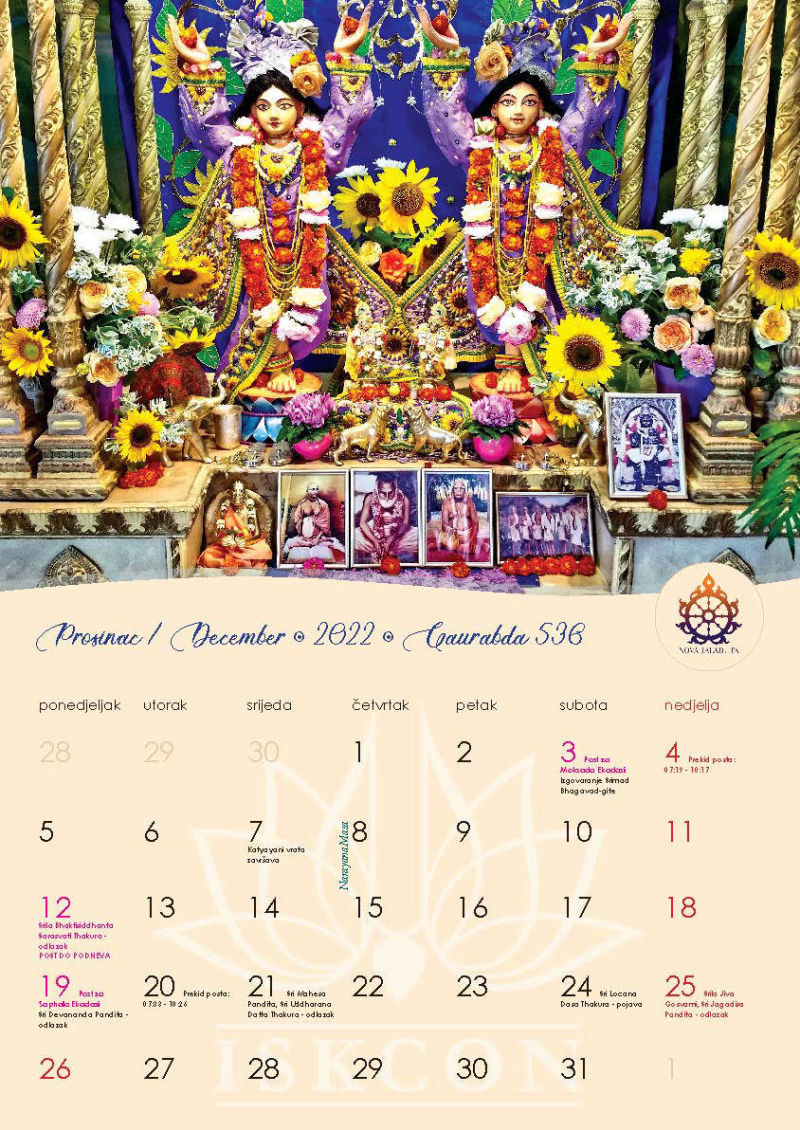 Novi kalendar za 2022. godinu s motivima naših prekrasnih Sri Sri Gaura Nitai te svim značajnim datumima koje vaišnave obilježavaju, napokon je izašao iz tiska i možete ga preuzeti u zagrebačkom hramu ili naručiti poštom, ako već niste.