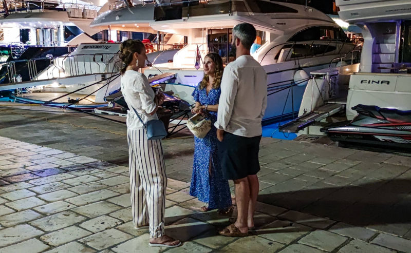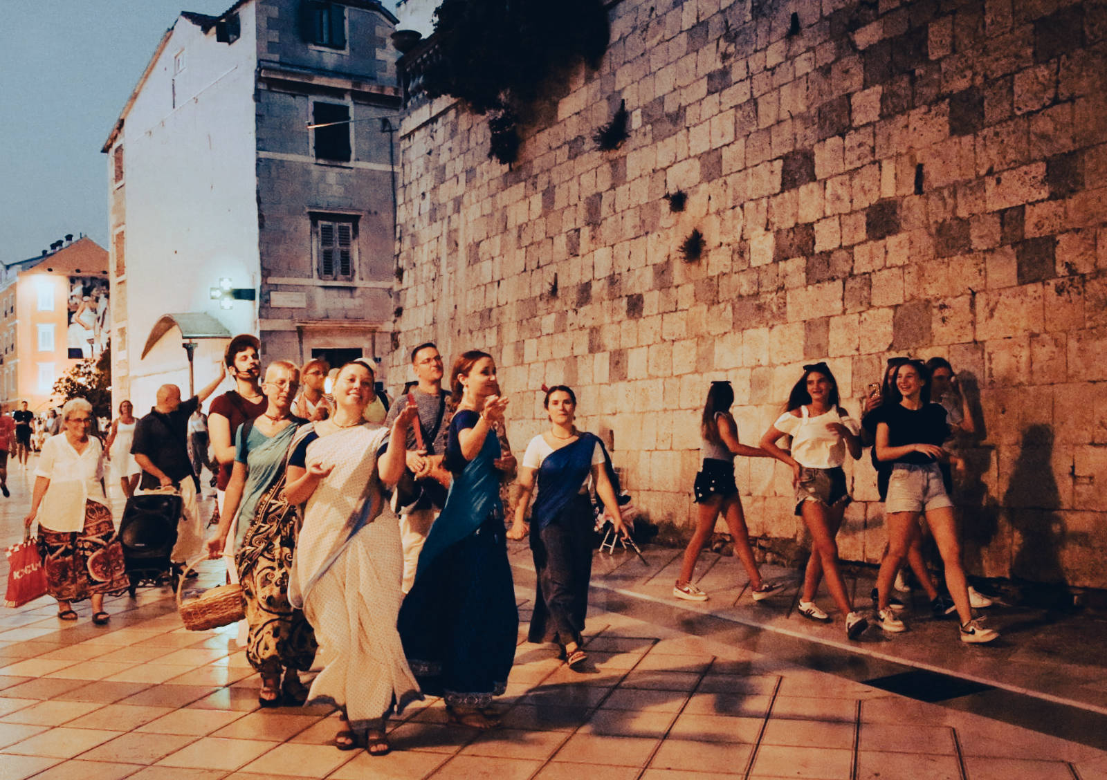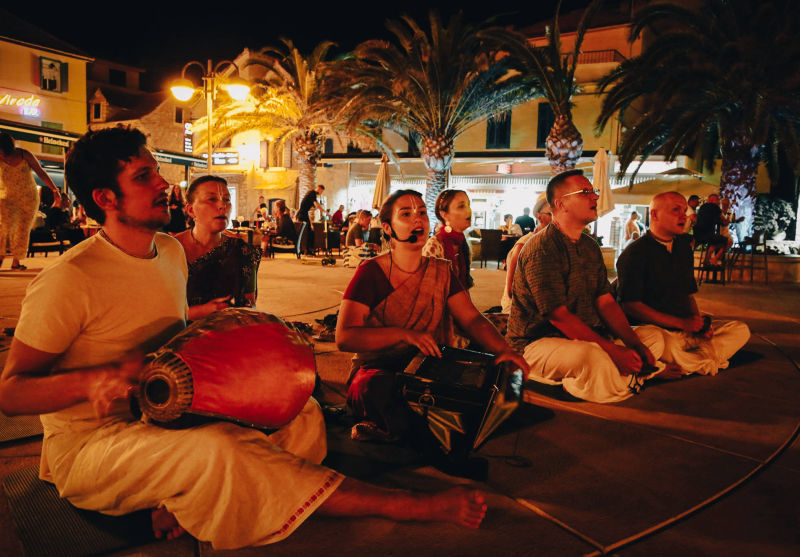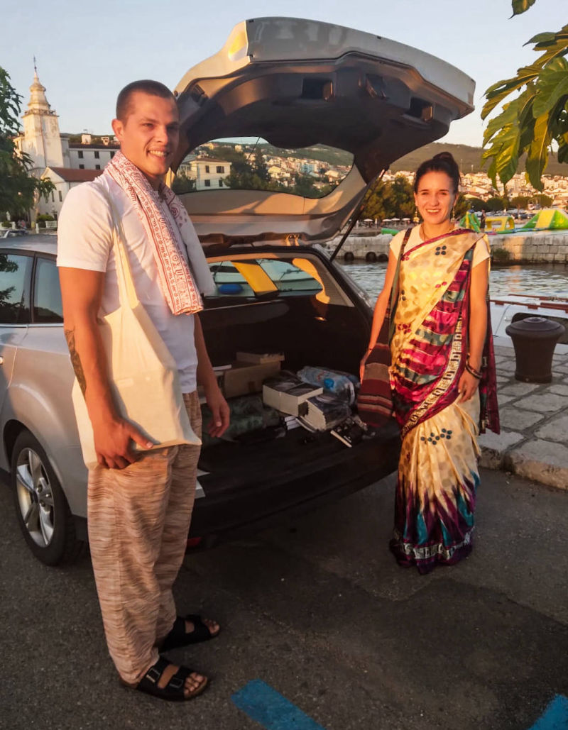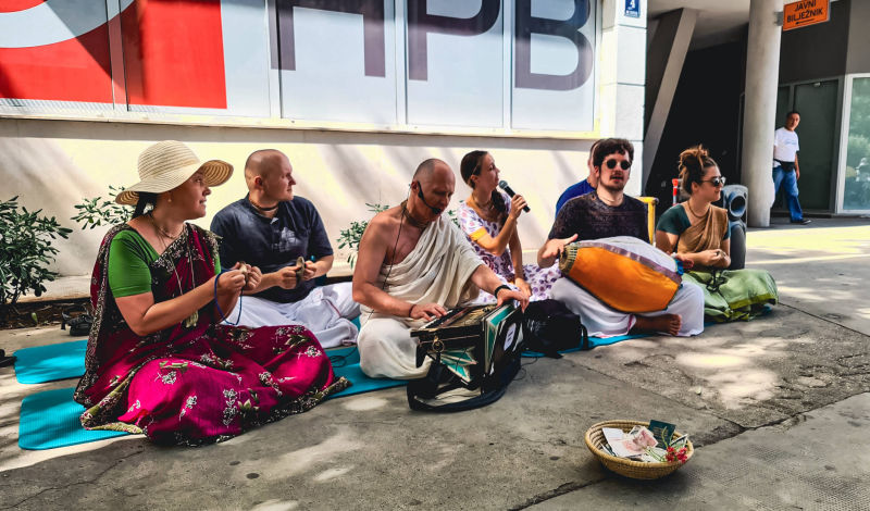 A dozen devotees from the harinam team 'Waves of sankirtan', and this year, in the period from 1.8. to 11.8., went on tour in the cities of Dalmatia, Kvarner and Istria, all the way from Split to Pula. Permanent members of the tour: Prema-murti d, Gaura-mitra d, Dharma-vatsala d, Uddhava-mitra d, bh. Alen, bh. Subala, Sadhumati-sakhi dd, Taruni Radha dd, Seva-kunja dd and bhn. Ploa, held a total of 13 harinams, and were joined by local devotees. A total of 252 books by Srila Prabhupada were distributed, and Uddhava-mitra das from Slovenia, who, as they say, distributed the books "at the speed of the mind", is most responsible for such a beautiful number. For the first time on the tour, prasadam was distributed, so 720 packets of prasadam ended up in the hands, but also under the teeth, of happy souls.