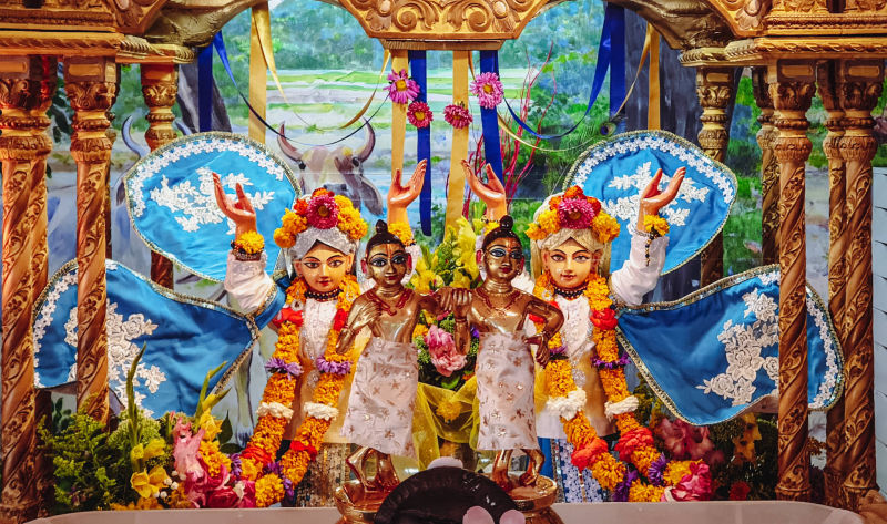 As a true Celebrant, in sumptuous white garments of golden color, with glittering jewels, a large turban on his head, and crowned with a beautiful flower garland, which he accepted from the devotees as their service to Him, the Lord was ready for this great day, just like the devotees, who served all day so that the Lord and His birthday guests could have a special transcendental experience.